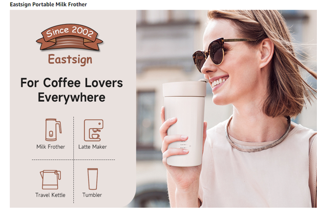 Eastsign’s 4-in-1 electric portable milk frother and steamer delivers a 12.3oz/350ml automatic hot and cold foam maker and milk warmer for lattes, cappuccinos and macchiatos. The product also serves as a portable electric kettle for conveniently heating hot water.