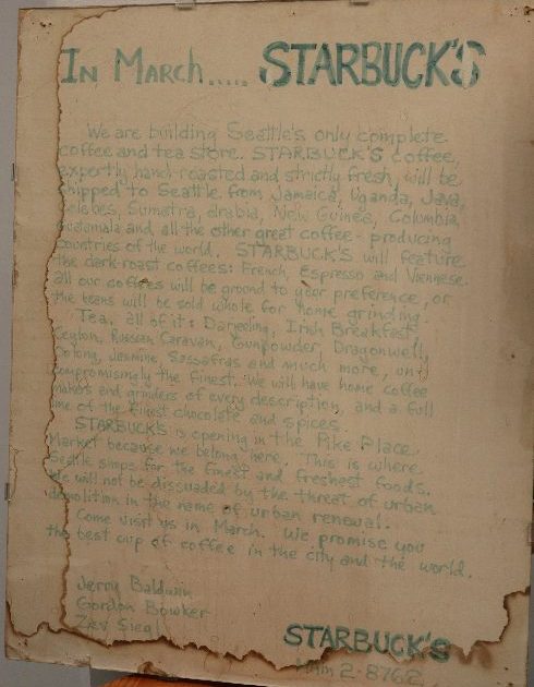 • A handwritten manifesto displayed outside the original Starbucks location;